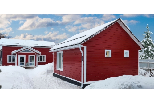 - При использовании покрытия Colority® Print, «ЭкоБрус GL» достигает максимального сходства с клееным брусом. Надежное скрытое сцепление панелей придает фасаду здания естественный вид.