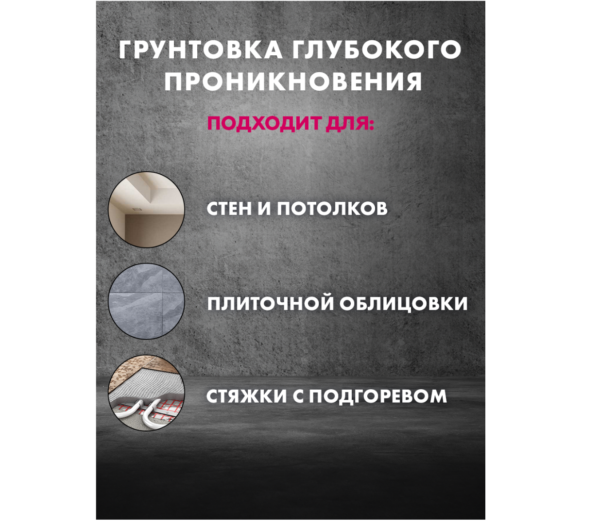 Грунтующий состав глубоко проникает в толщу обрабатываемой поверхности, укрепляя её и снижая впитывающую способность. Он повышает адгезионные характеристики оснований и предотвращает пересыхание тонкослойных выравнивающих смесей. Также грунтовка улучшает текучесть напольных стяжек, обеспечивая их равномерное распределение, и препятствует образованию воздушных пузырьков в выравнивающем слое.